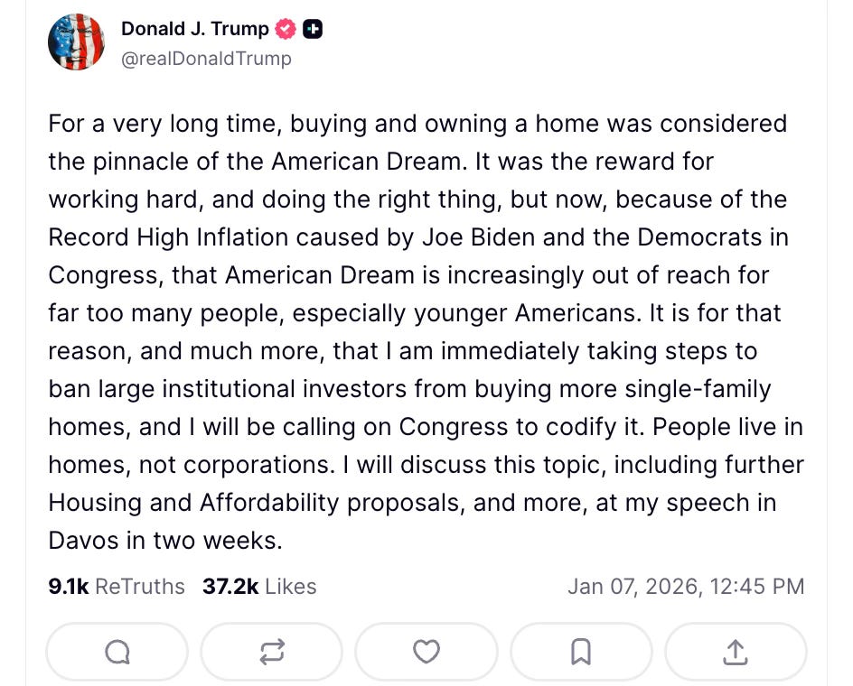 Earlier today President Trump moved markets when he posted on Truth Social that he is issuing an Executive Order banning “large institutional investors from buying more single-family homes. “People live in homes,” he added “not corporations.”