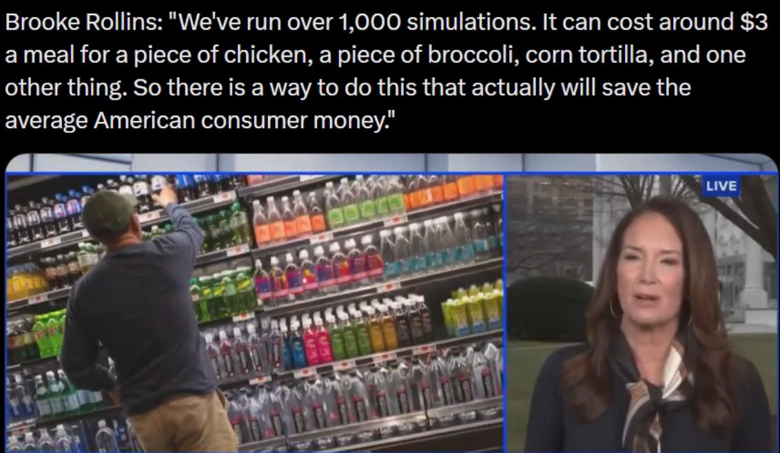 Forget about a tariff rollback, price gouging ban or investment in research and development, the Trump administration has another recipe for making groceries affordable. According to Agriculture Secretary Brooke Rollins, Americans can save money if they eat one piece of chicken, broccoli, a corn tortilla, and one other thing. According to Rollins, on our dime her department has run over 1,000 simulations to come up with this suggestion, a nutritious meal that will cost just $3.
