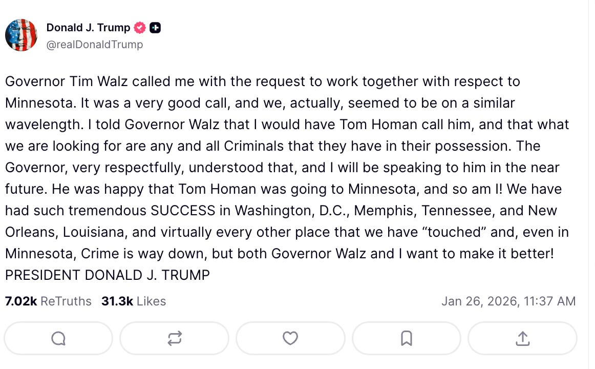 It gave some people solace when, speaking with theWall Street Journal late Sunday, President Trump took a slightly less vitriolic tone than most of his aides and Cabinet members. Likewise, Monday when he took to Truth Social to announce he had a “good call” with Minnesota Gov. Tim Walz, they were “on a similar wavelength” and he was sending Tom Homan to Minnesota.