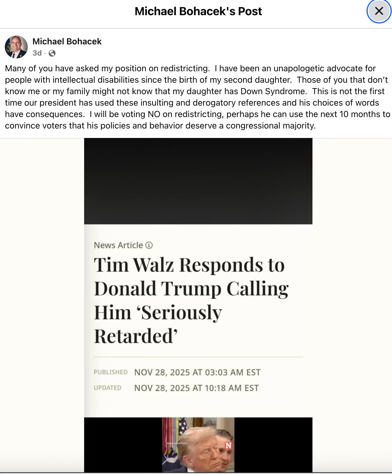 Bohacek, whose daughter has Down Syndrome, included a photo of an article about Trump’s comments about Walz in his statement.