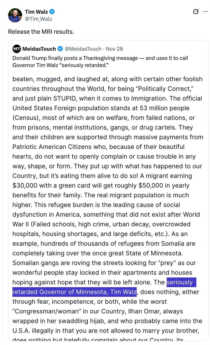 On Air Force One last night, Trump was asked by reporters about recent calls from Minnesota Governor Tim Walz to release his MRI results. This came after the President took to Truth Social on Thanksgiving night and used a slur widely regarded as derogatory towards people with intellectual disabilities to describe the Governor.
